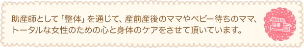 助産師・看護師として生命の誕生に立ち会わせていただき、たくさんの女性と関わっていく中で、出産の場だけではなくもっと身近に皆さんと関われるようにしたいと「整体」の道へ進みました。